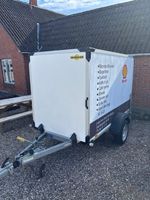 Lukket flyttetrailer med mål Brede 130 cm X Længde 250 cm Højde 150 cm Der er kroge indvendig så man kan fastspænde ting.